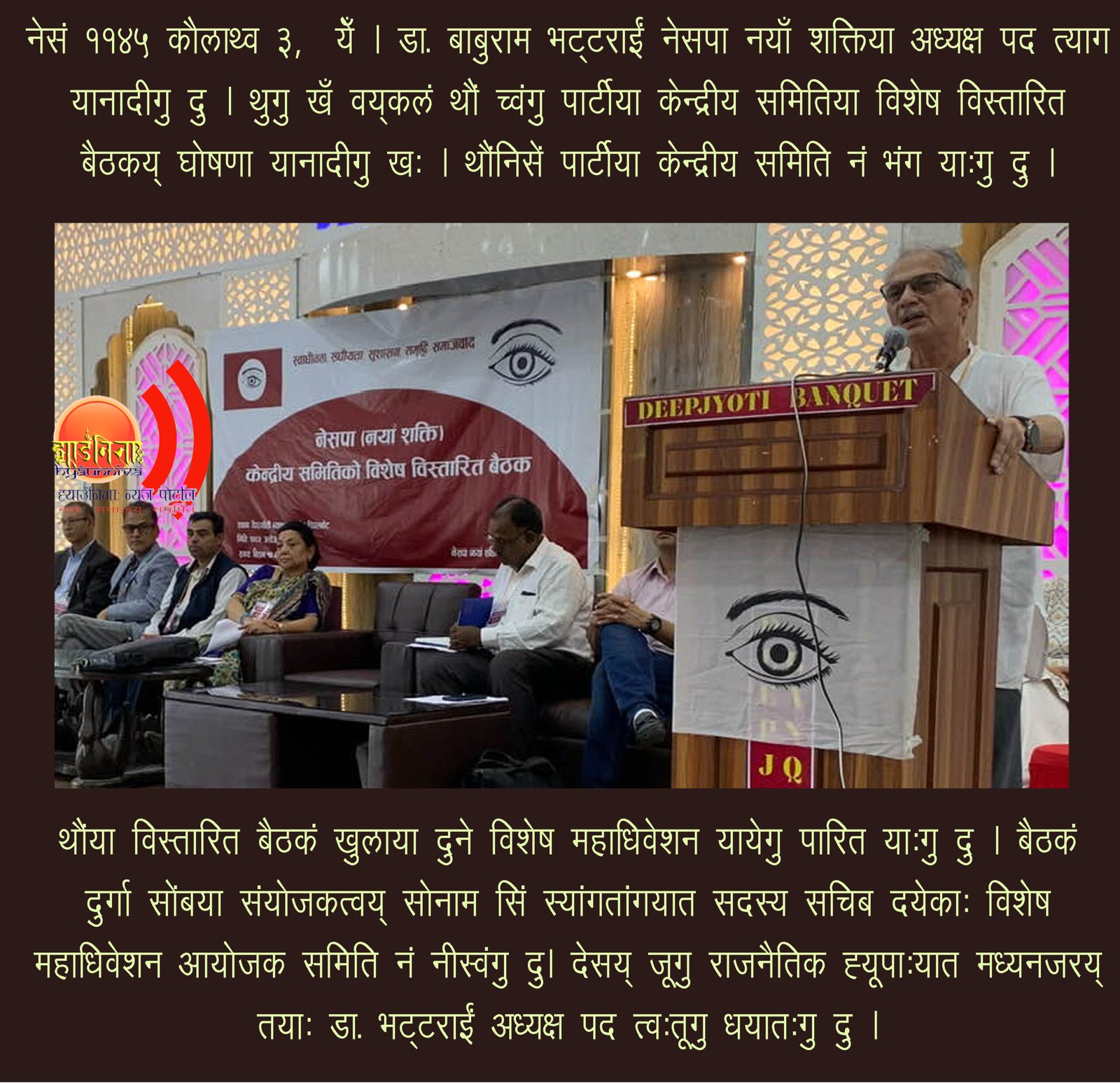 नेसं ११४५ कौलाथ्व ३, येँ । डा. बाबुराम भट्टराईं नेसपा नयाँ शक्तिया अध्यक्ष पद त्याग यानादीगु दु । थुगु खँ वय्कलं थौं च्वंगु पार्टीया केन्द्रीय समितिया विशेष विस्तारित बैठकय् घोषणा यानादीगु खः । थौंनिसें पार्टीया केन्द्रीय समिति नं भंग याःगु दु ।