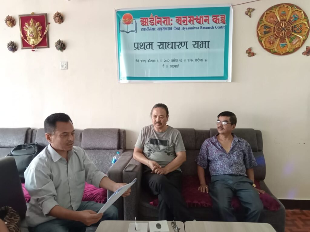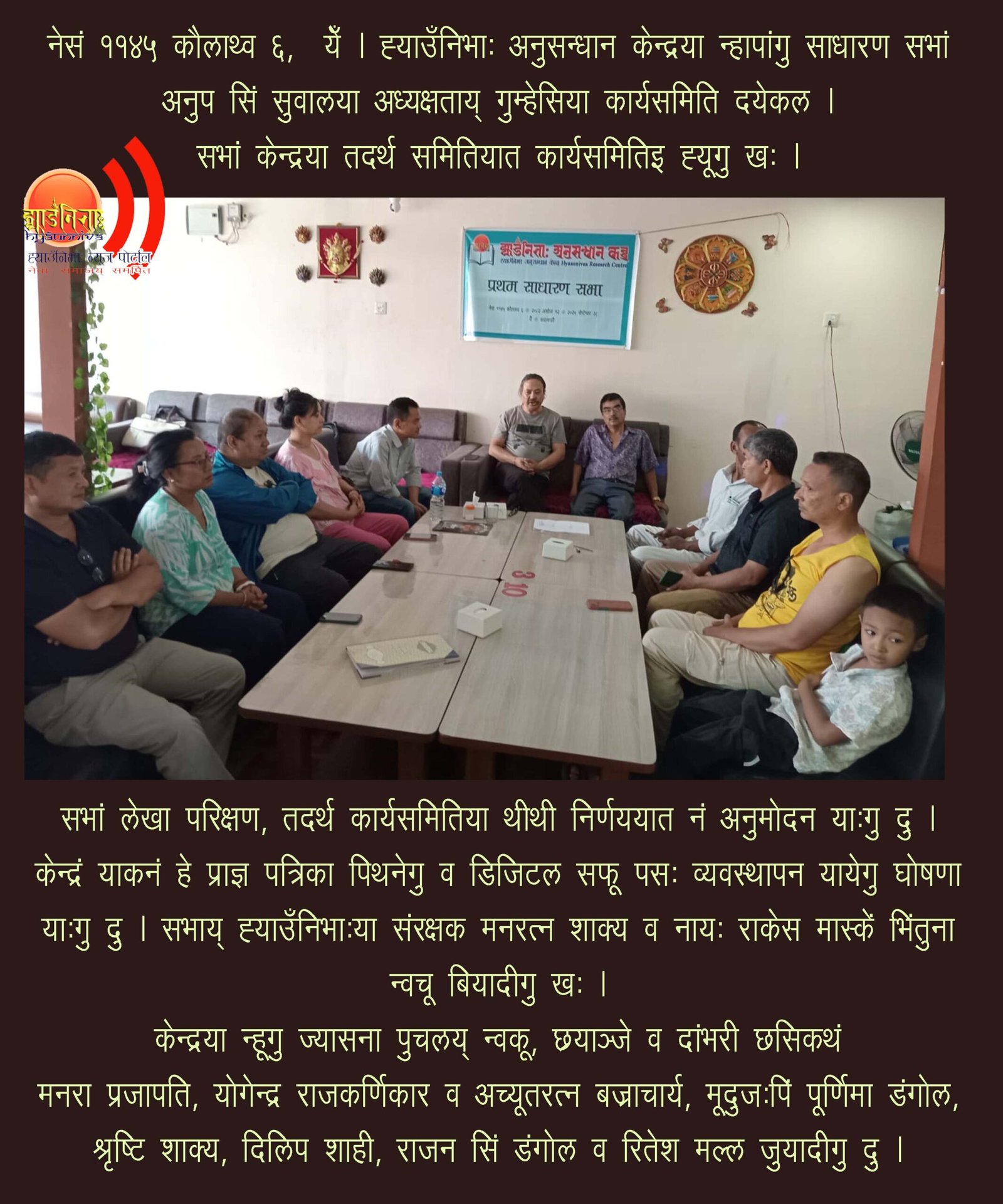 नेसं ११४५ कौलाथ्व ६, येँ । ह्याउँनिभाः अनुसन्धान केन्द्रया न्हापांगु साधारण सभां अनुप सिं सुवालया अध्यक्षताय् गुम्हेसिया कार्यसमिति दयेकल । सभां केन्द्रया तदर्थ समितियात कार्यसमितिइ ह्यूगु खः ।